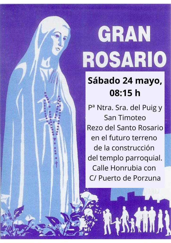 En pleno comienzo del curso tenemos la gran alegría de celebrar la fiesta parroquial de Ntra. Sra. del Puig el primer domingo de octubre para encomendar a la Virgen María todos nuestros proyectos e ilusiones en este nuevo año pastoral.      La preparación a la fiesta consistirá en un Triduo con el rezo del Santo Rosario de las 18:30 y una homilía especial en la Misa de 19:00, durante los días del 2 al 4 de octubre. Se puede traer una ofrenda floral. Se concluirá la preparación con la gran celebración de la Fiesta el domingo 5 octubre en las Misas habituales.